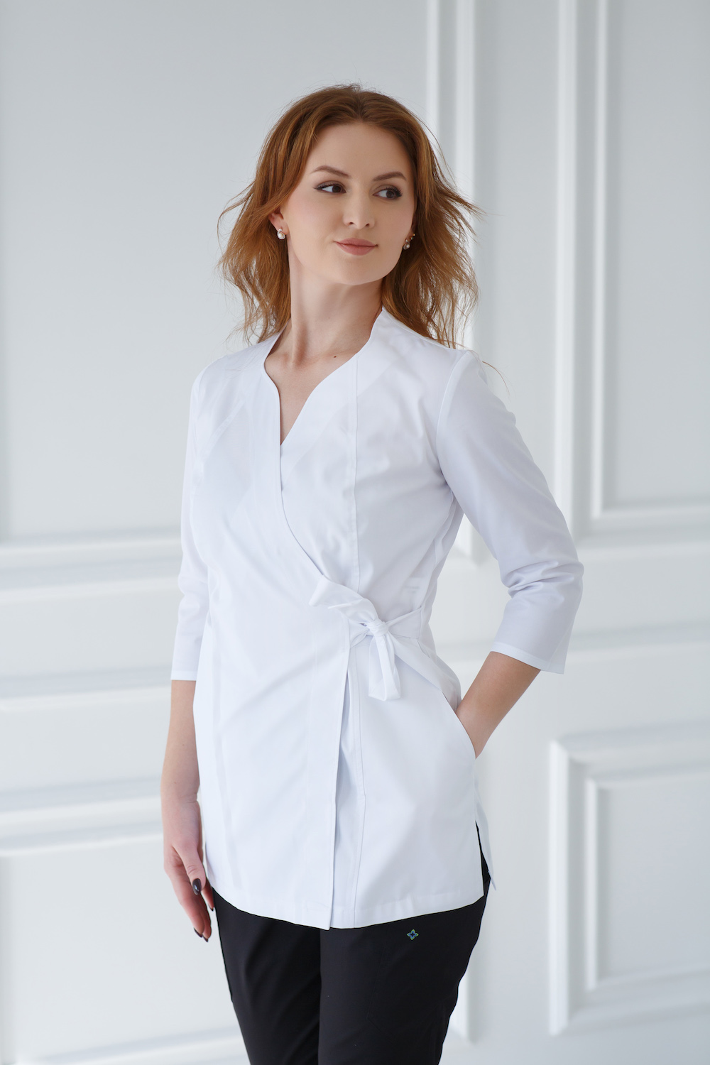 Елегантна блуза на запах, гарна посадка по фігурі забезпечується вертикальними рельєфними швами по переду і спинці. Рукав втаєний, довжиною 3/4. Горловина має невелику стійку по шиї ззаду, а перед з фігурним вирізом. Виріб чисто білий, без оздоблень та надмірностей. Блуза фіксується на внутрішні вузькі зав'язочки та гарний пояс зліва. Виріб на запах стане винятковим доповненням робочого гардеробу. Така річ зручна тим, що дозволяє регулювати свободу по фігурі.