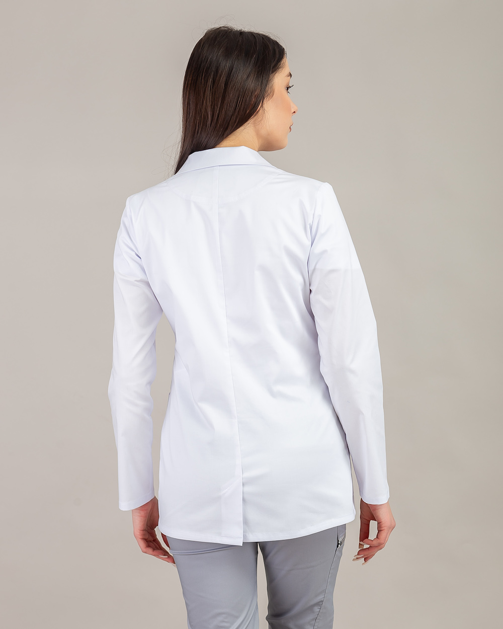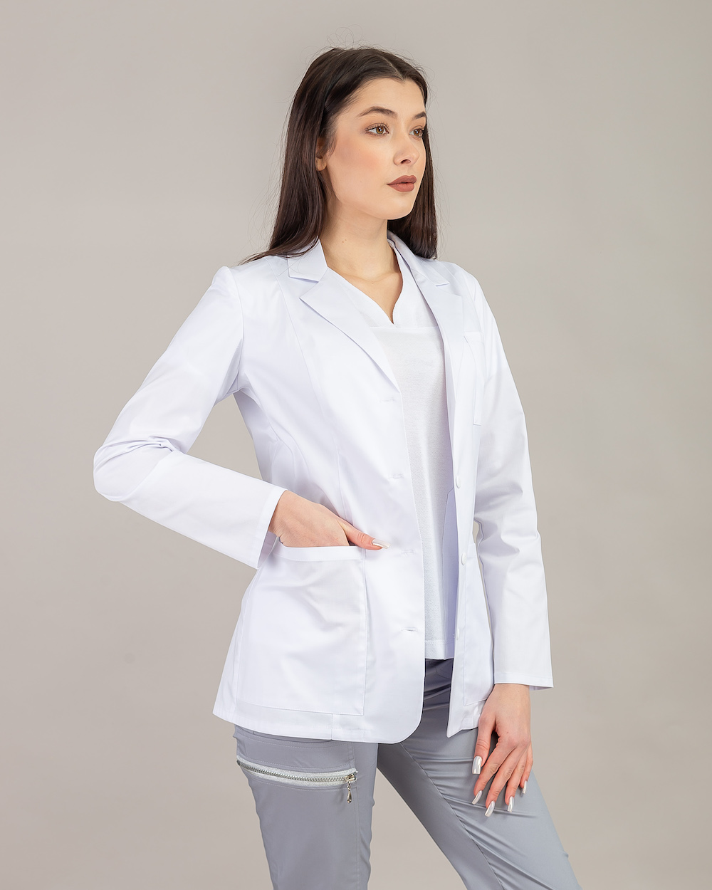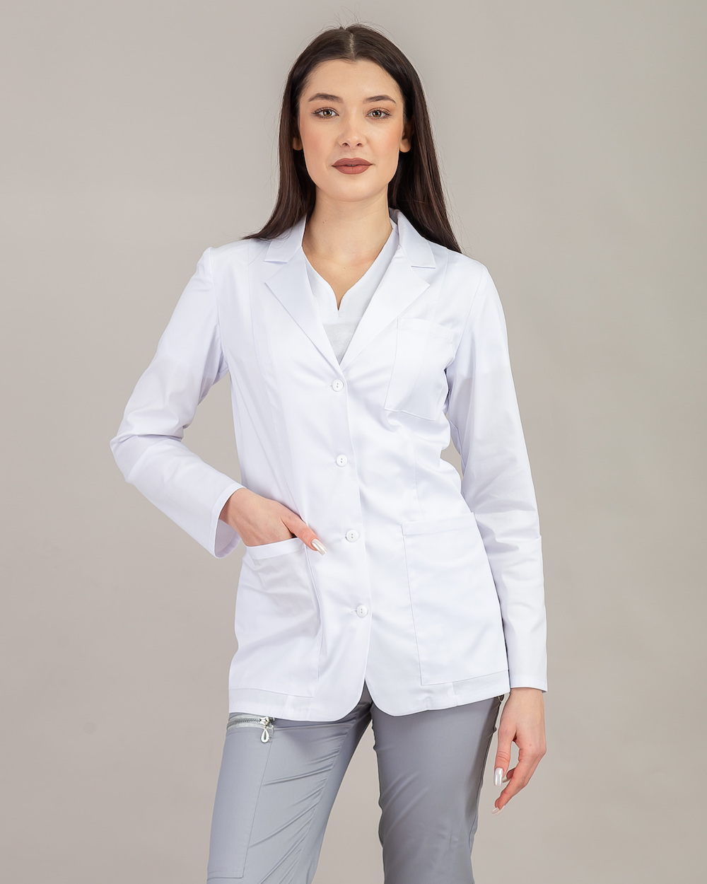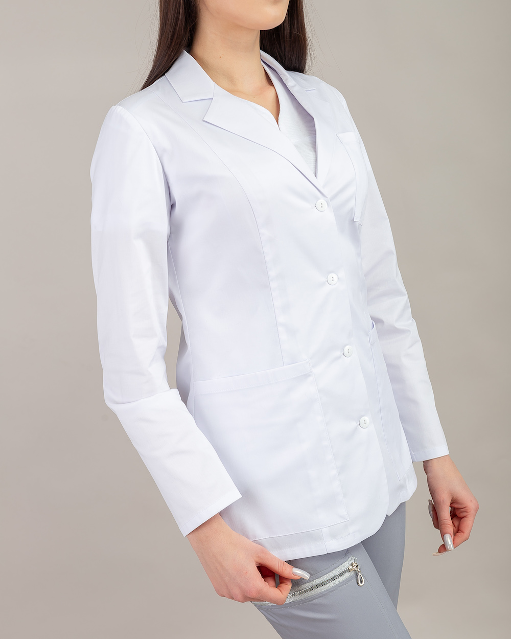 Білий жіночий медичний піджак, створений спеціально для комфортної роботи в медичному або косметологічному середовищі. Виготовлений із щільного стрейчевого матеріалу, який добре тримає форму, приємний до тіла та не сковує рухів.