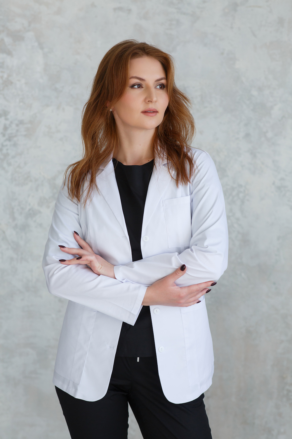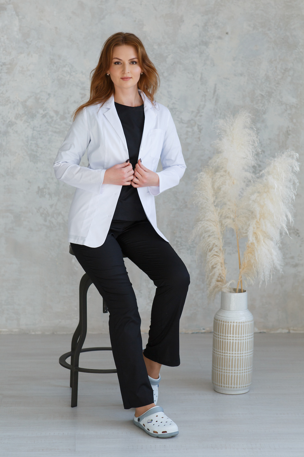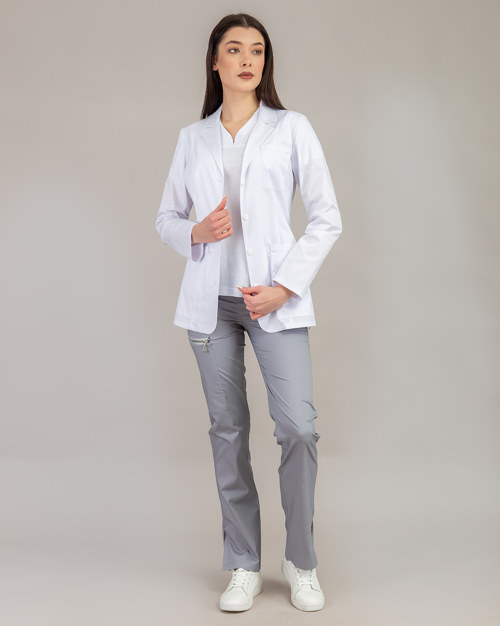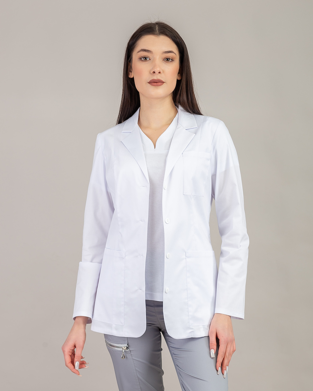 Білий жіночий медичний піджак, створений спеціально для комфортної роботи в медичному або косметологічному середовищі. Виготовлений із щільного стрейчевого матеріалу, який добре тримає форму, приємний до тіла та не сковує рухів.