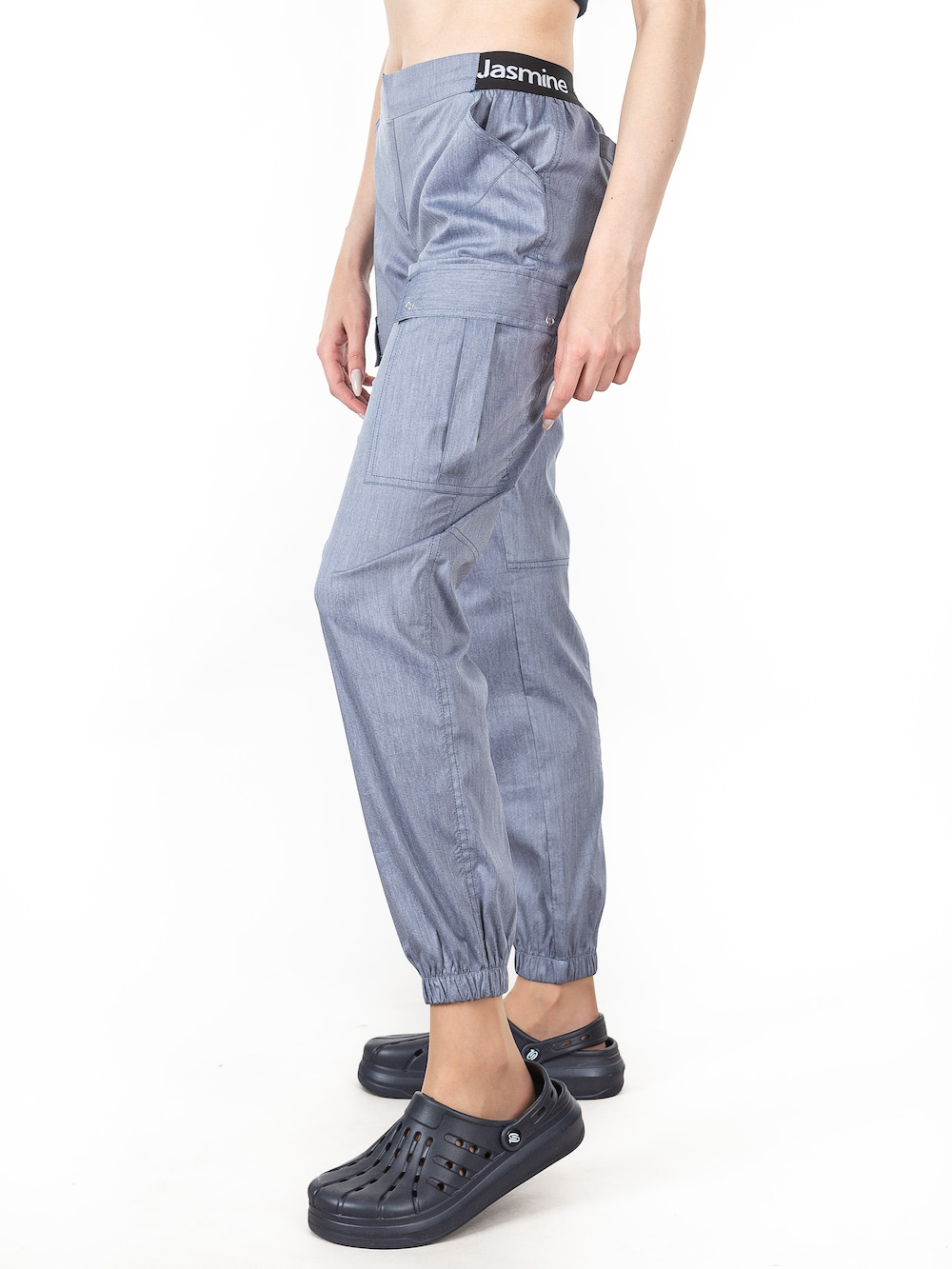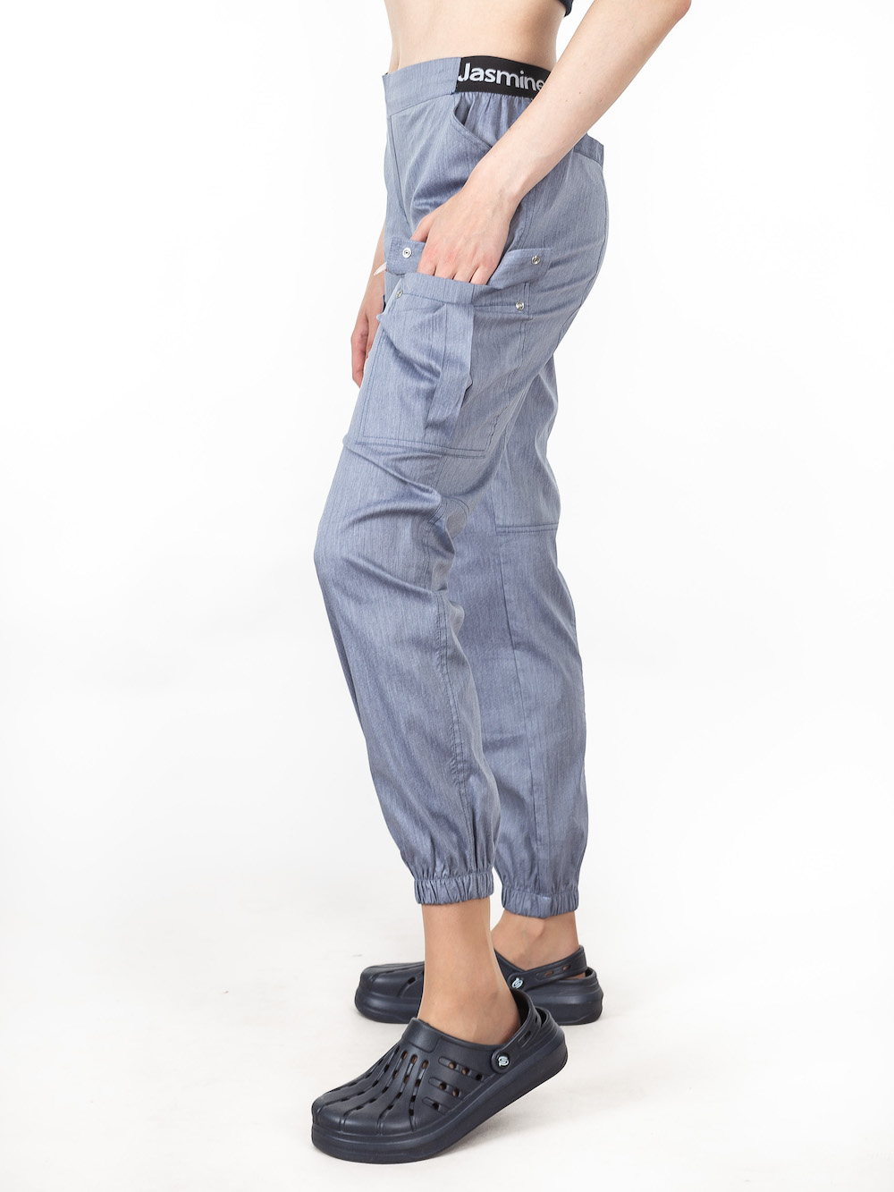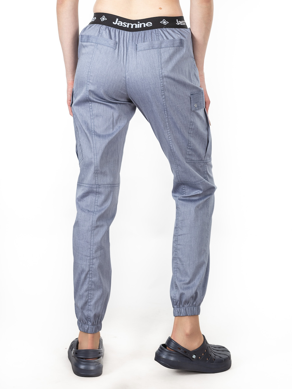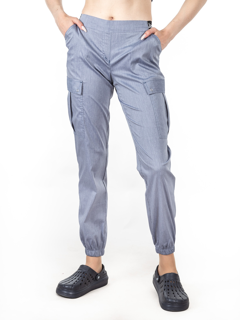 Сучасні медичні штани з комфортною посадкою у цікавому відтінку: сіро-блакитний джинс. На поясі та подолах зручні еластичні резинки, які не обмежують рухів у процесі роботи.